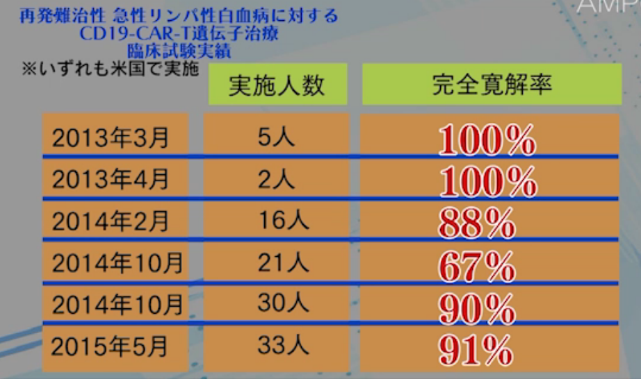 臨床試験でこの治療を受けた「急性リンパ性白血病」患者の寛解率(病状が落ち着き、臨床的に問題がない程度にまで治った割合)が8割から9割という結果が公表されています。